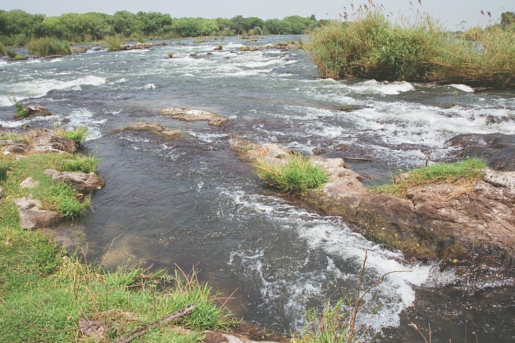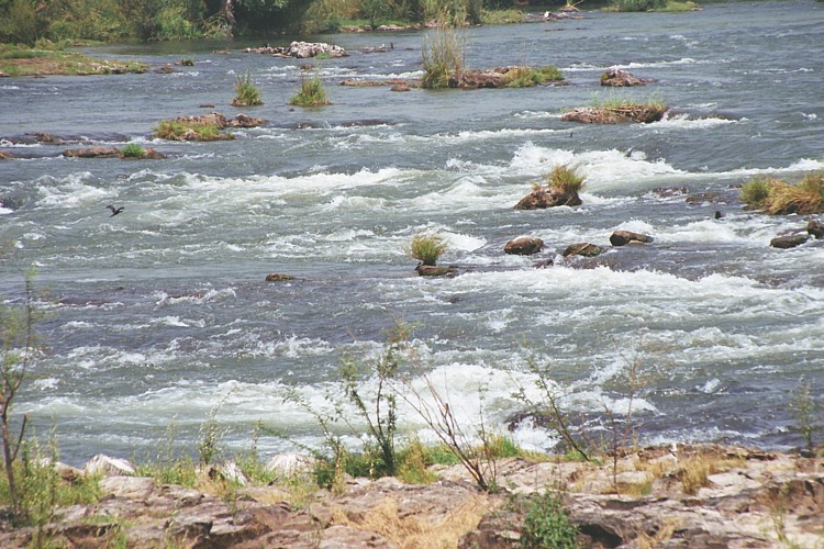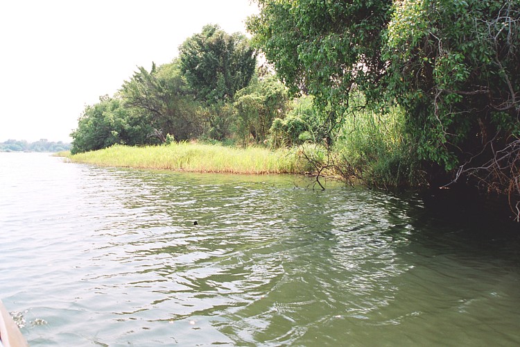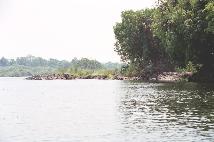 インパリラ島の東端でチョベ川はザンベジ川と合流、ザンビアとジンバブエの国境を作り、ビクトリアの滝となって流れ落ちる。